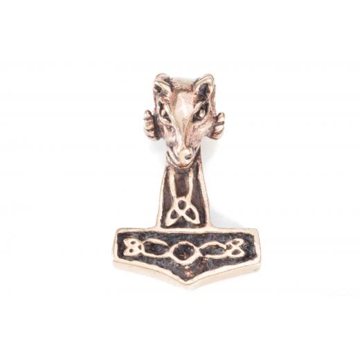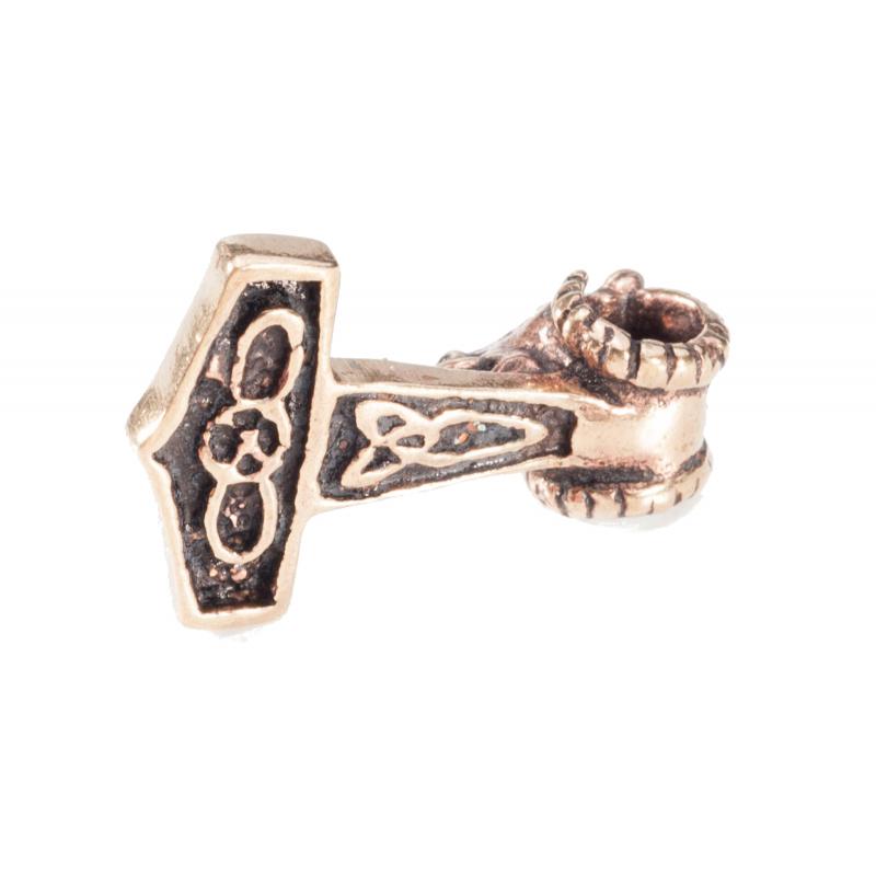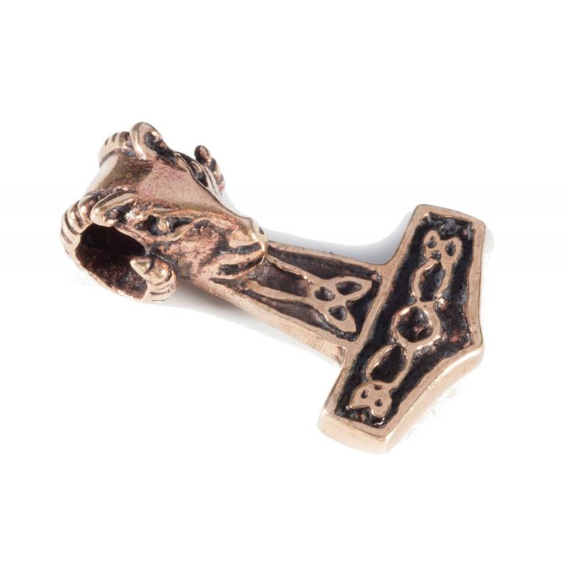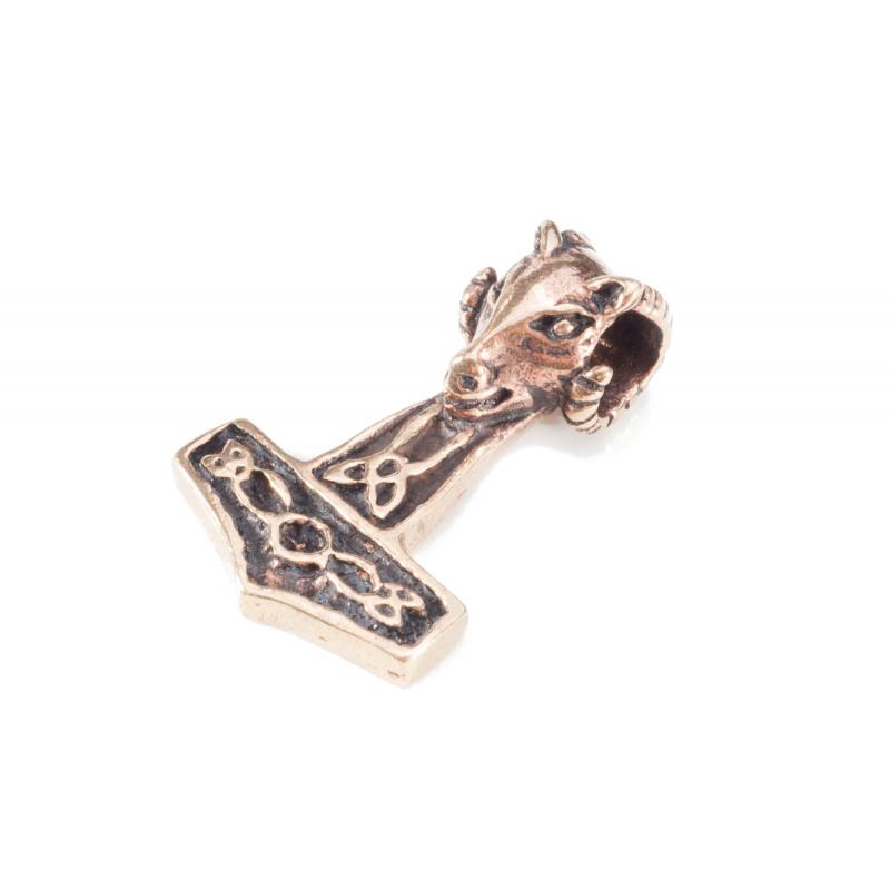 Ein kleiner, verzierter Thorshammer als Schmuck-Amulett mit einem Widderkopf aus Bronze. Das Amulett ist beidseitig mit Wikinger-Mustern verziert. Wirkt schlicht und passt zu jeden Typ! Ein mächtiges Geschenk, das mit Sicherheit viel Freude bringt.