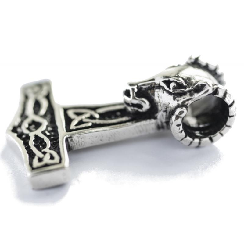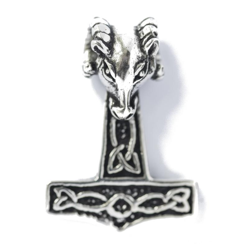 Ein Thorshammer als Schmuck-Amulett mit einem Widderkopf, für dich in echt 925 Sterlingsilber. Der Widderhammer ist beidseitig mit Knotenmustern verziert.