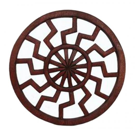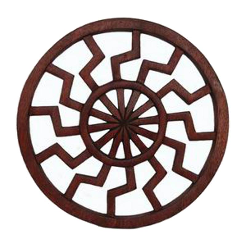 Eine handgeschnitzte Schwarze Sonne als Wanddekoration aus Holz.