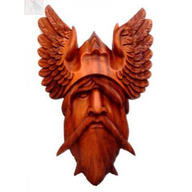 Des Odins Kopf, handgeschnitzt aus einem Stück Soar Holz. Der germanische Göttervater wird mit nur einem Auge dargestellt. Odin opferte an der Quelle des Riesen Mimirs ein Auge, um Einsicht zu erlangen. Dem liegt folgendes zugrunde: Geben wir eine Sichtweise auf, so gewinnen wir eine andere.