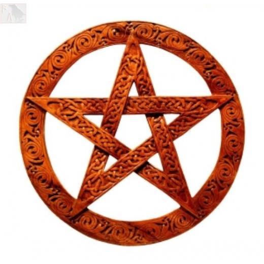 Ein großer, von Hand geschnitzter Drudenfuß, mit keltischen Knoten verziert aus Soar Holz. Das Pentagramm ist ein kräftiges Schutzsymbol und ein Zeichen für den Menschen. Es verstärkt auch die Erfüllung der Wünsche.