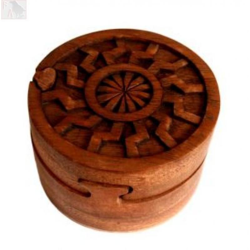 Ein Sonnensymbol auf einer Schmuckschatulle aus Holz. Die Vierteilige Schmuckdose bietet ein kleines Fach für Eure Kostbarkeiten.